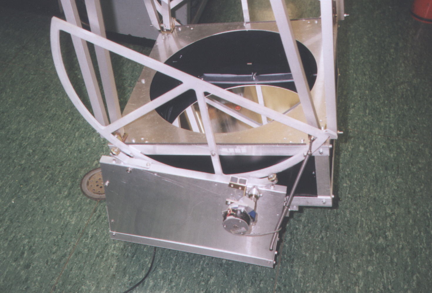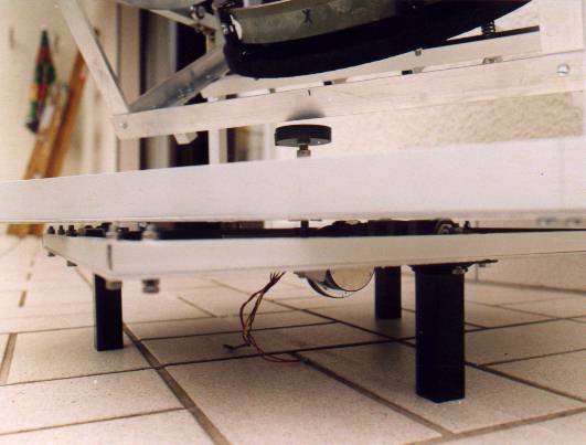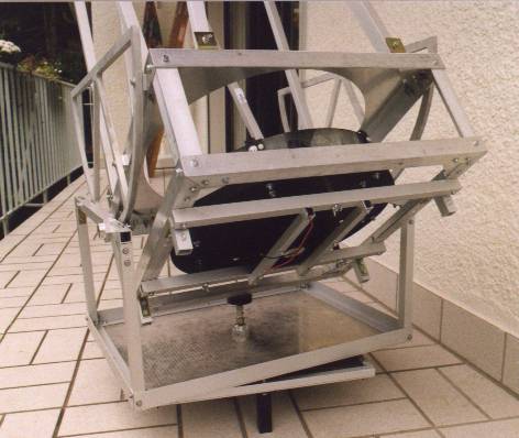 Das künstliche Gegengewicht in Form zweier Stahlzugfedern ersetzt 6 kg. Besonders schön sind die schwingungsdämpfenden Eigenschaften. Das Teleskop schwingt nach längstens 2-3 Sekunden aus. Der (noch unverkleidete) Alt-Motor und das Getriebe sind links daneben zu erkennen.