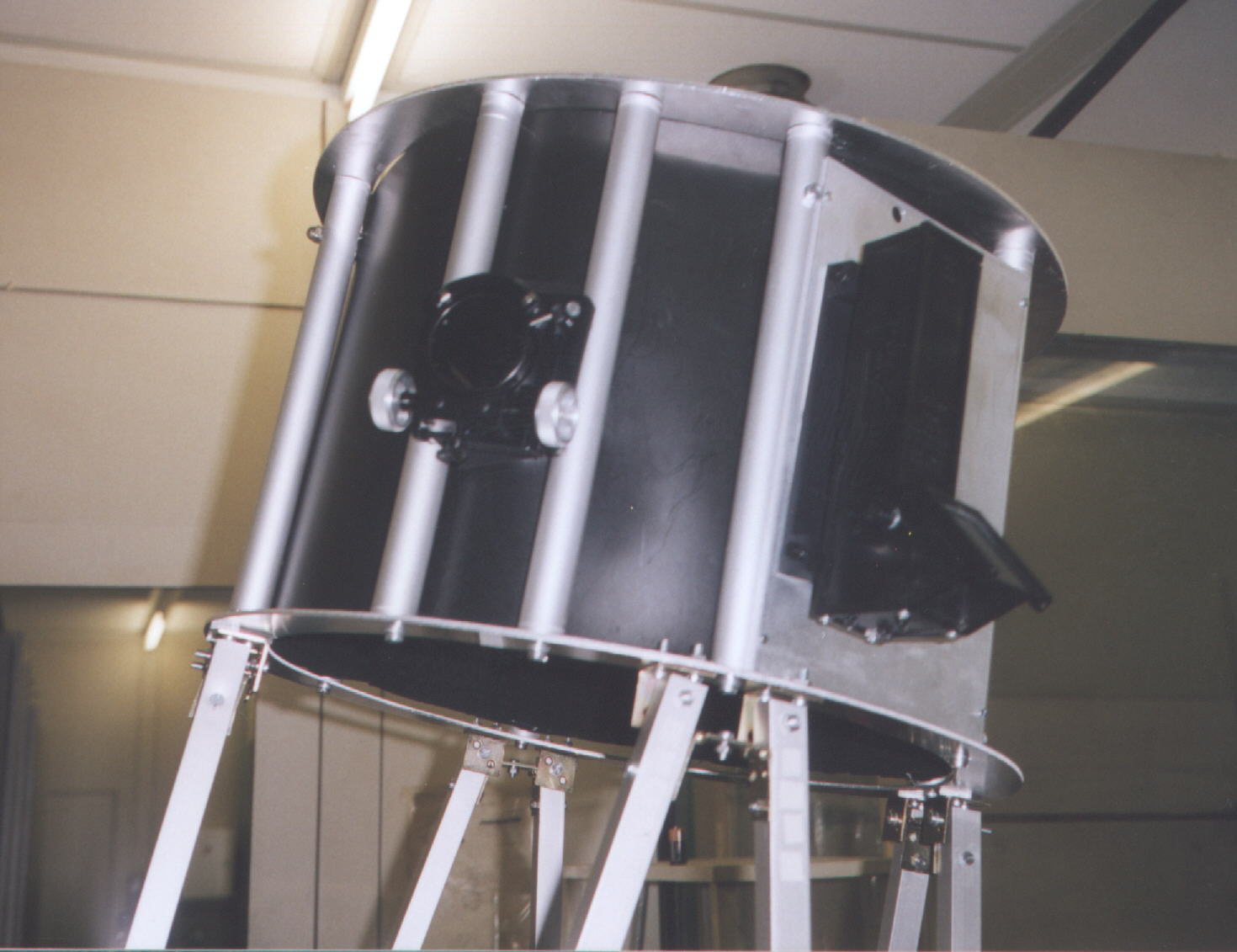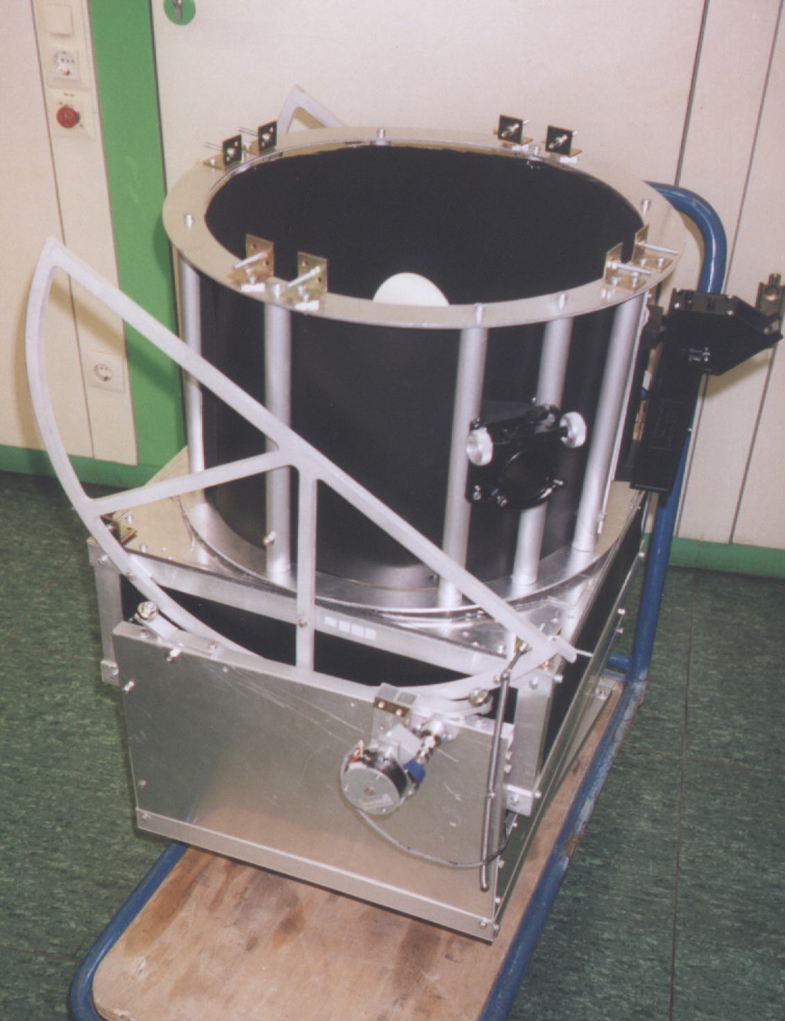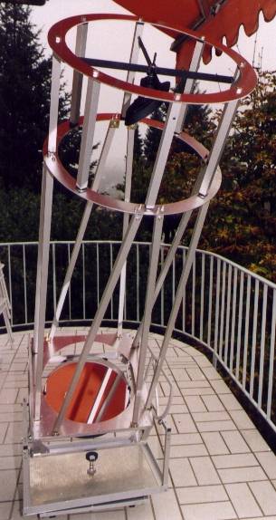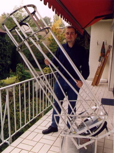 Das fertiggestellte Teleskop im momentanen "Zustand". Im zweiten Bild mit der Schutzhülle aus Kunststoff-Fliegengitter.
