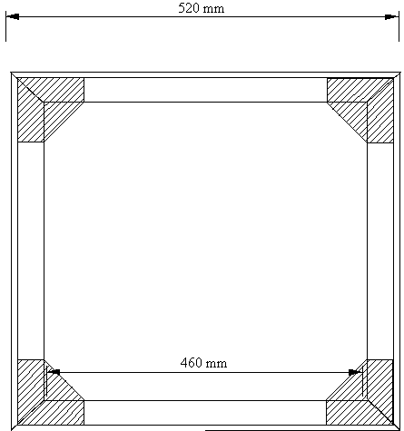Je vier geschrägte Aluwinkel bilden jetzt den Grundrahmen: Als Verbindungsteile dienen je vier abgeschrägte Alubleche 70x70 mm (an den Ecken 27 mm = 30 - 3 ) die mit jeweils 4 M5-Edelstahlschrauben und Muttern samt Unterlegscheiben verbunden werden. Mit einem Winkeleisen beim Bohren auf exakt rechte Winkel achten, sonst wird die gesamte Spiegelbox schief !