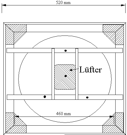 Auf der Spiegelbox ist ein Schutzdeckel aus 2 mm dicken Aluminiumblech aufgeschraubt. Der Deckel besteht aus ein 52x52 messenden Blech, in das mit einem Laser ein 455 mm breites Loch geschnitten wurde (geht natürlich auch mit der Stichsäge).