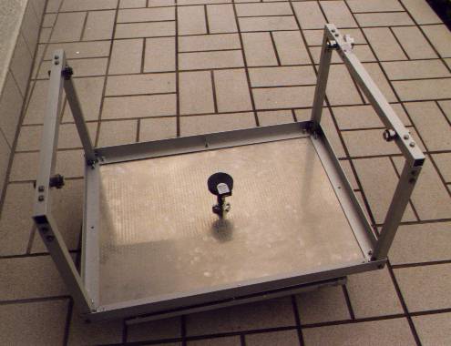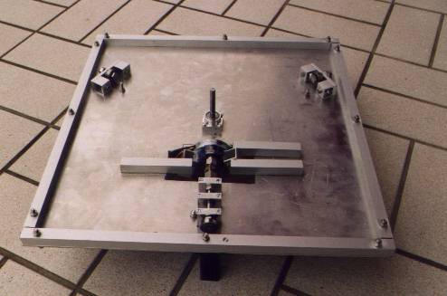 Die Auflage für die DEC-Räder besteht aus einer einfachen 3 mm-Aluminiumplatte mit den Maßen 60x52 cm. Sie ist am Rand mit aufgeschraubten Aluminiumvierkanten versteift. In den Ecken sitzen Vierkantkonstrukte mit Querträgern, in die je zwei Lauflager eingelassen sind, auf denen die DEC-Räder sitzen. Die Konstrukte werden mit weiteren Aluminiumprofilen gegen Schwingungen und Verwindung versteift. Das Aluminiumplatte sitzt als als rotierende Plattform auf dem Standfuß.
