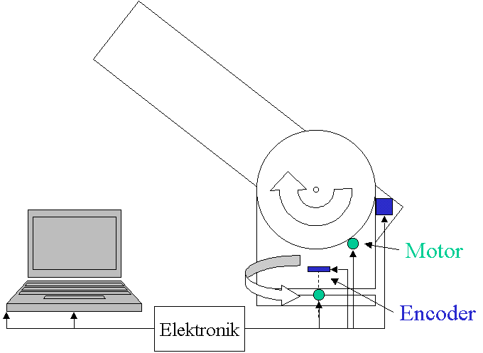 Die Elektrik des 16"-Aludobsons (siehe Abb. 1) besteht aus 2 Schrittmotoren mit angeflanschten Getrieben und 2 Winklemessern, die über eine einfache Treiberplatine durch einen angeschlossenen PC gesteuert (bzw. ausgelesen) werden. Die zugehörige Steuersoftware beherrscht neben umfangreichen GOTO-Funktionen auch Scrolling zum Abfahren großflächiger Deepsky-Objekte wie z.B. den Cirrusnebel. Die wichtigsten Funktionen bestehen aber in der Korrektur aller nur denkbaren Montierungsfehler, so daß bei der Nachführung auch mit einer Dobsonmontierung eine Genauigkeit im Bogensekundenbereich erzielt werden kann. Allgemeines zur Hard- und Software findet sich beim Entwickler Mel Bartels: