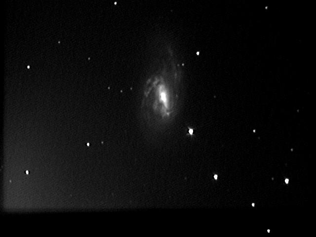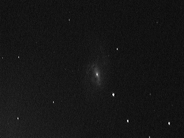 Es sind ein paar Sterne und der helle Galaxienkern umgeben von einer schwachen Halo zu sehen. In der linken unteren Bildecke ist das Bild etwas heller, weil der Vorverstärker des CCD ICX424AL hier etwas Signal einstreut. Bei früheren Webcams Vesta oder Toucam SC1 ist der Effekt aber wesentlich stärker.