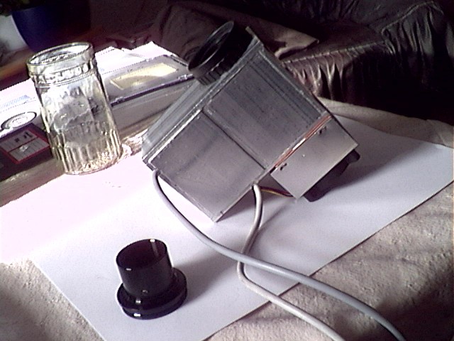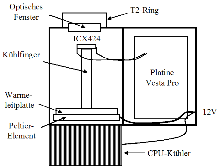 Alle Teile sind mit gewöhnlichem UHU-Modellbaukleber miteinander verbunden. Als Netzteil dient ein gewöhnliches altes PC-Netzteil, dass die notwendigen Ströme von mehreren Ampere bei 12V für das Peltier-Element liefern kann. Die Wärme wird auf das Metallgehäuse abgeleitet und größtenteils von einem CPU-Lüfter an die Umgebung abgeführt. Der Rest hält das Gehäuse angenehm warm, was im Winter die Arbeit sehr erleichtert, zumal das optische Fenster nicht zutaut. Das CCD ist durch die Restwärme auch nicht das kälteste Teil, so dass die Restfeuchte am Kühlfinger abgeschieden wird. Der Kühlfinger sitzt auf einer Metallplatte als Wärmeverteiler auf dem Peltier-Element. So wird die Betriebswärme des CCD auch bei abgeschalteter aktiver Kühlung und kalter Umgebung ausreichend abgeführt.