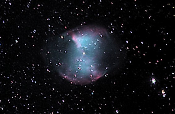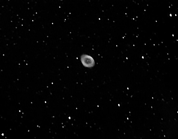 Der Ringnebel M57 in Lyra. Der Zentralstern ist erkennbar, der Nebel vor einem reichen Sternenfeld. Im Sternfeld ist der Kern von IC1296 schwach angedeutet (als etwas unscharf wirkender "Stern" rechts des Ringnebels auf halbem Weg zum rechten Bildrand).