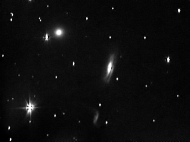 Die NGC3190-Gruppe in Leo (Hickson 44), links oben NGC3193, die Galaxie mit dem Staubstreifen ist NGC3190, unten rechts ist NGC3187 mit den angedeuteten abgewinkelten Armen.