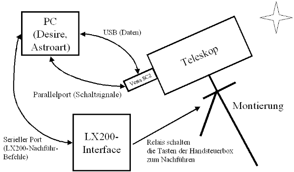 In einer weiteren Ausbaustufe wird sich die Kamera über ein LX200-kompatibles Interface mit Relais auf einer EQ-5 selbst nachführen können. Dann sollten Belichtungen mit 10 Minuten ohne Probleme möglich werden. Das Selfguiding-Verfahren arbeitet wie bei den bekannten Starlight-Xpress-Kameras durch parallele Benutzung der geraden und ungeraden CCD-Zeilen. Die einen Zeilen werden für die Langzeitbelichtung gebraucht, die anderen Zeilen werden alle paar Sekunden ausgelesen und dienen als Nachführwerte für das Selfguiding über einen Leitstern. Das Verfahren arbeitet im Prinzip, allerdings sind momentan die Originalmotore meiner EQ5 viel zu "flexibel". Getriebespiel wäre kein Problem, aber das Verbiegen der Zahnradachsen führt zu nicht nachvollziehbaren Fehlern.